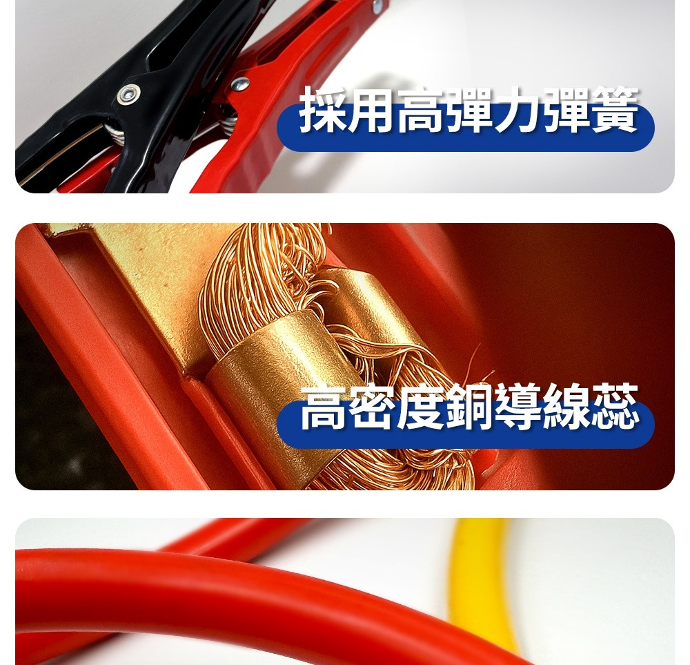 採用高純度銅鋁複合導線,導電性佳、電流穩定,適用於轎車、SUV、貨卡與中型卡車等多種車型。外層加厚絕緣橡膠,耐高溫、抗凍裂,有效防止漏電與短路。全銅鱷魚夾設計夾力強勁,緊密咬合電瓶端口,確保啟動安全。
