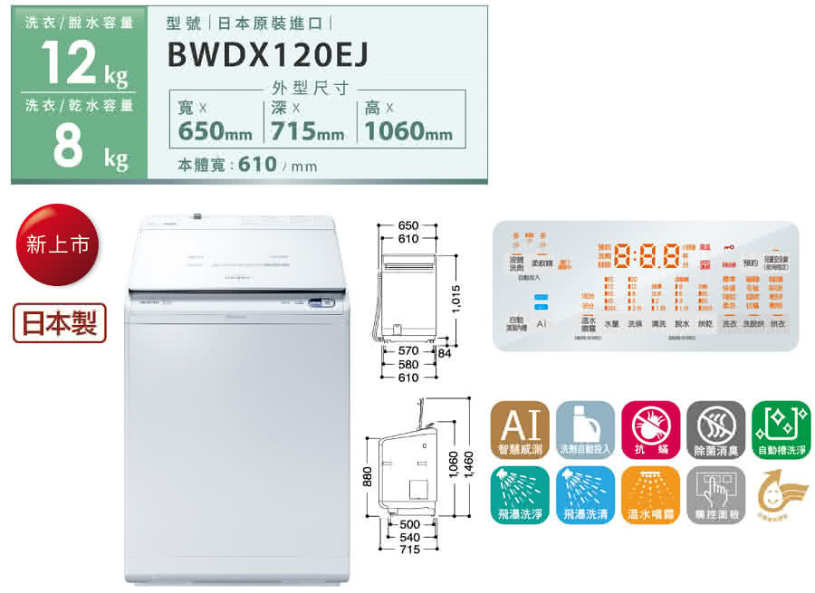HITACHI 日立 日製變頻直立洗脫烘洗衣機 琉璃白 12公斤|BWDX120EJ-W