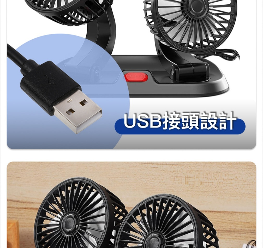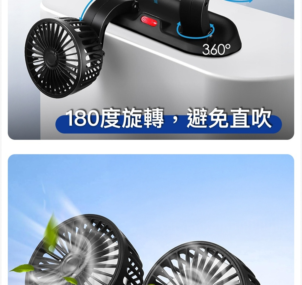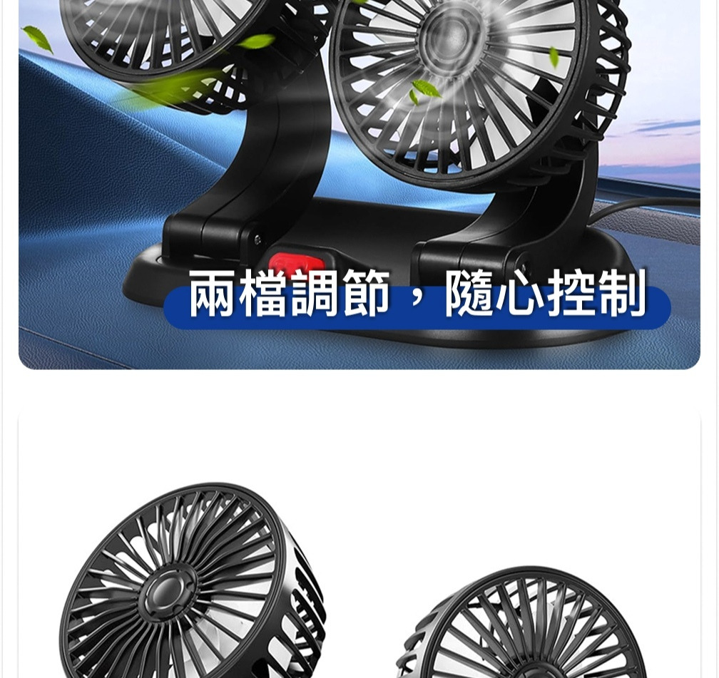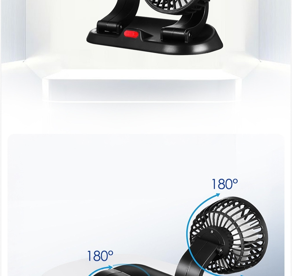 炎夏日駕車不再悶熱!雙頭180度兩段式 USB 車用電扇,採用雙風頭設計,左右可獨立調整角度,風向覆蓋更廣,讓前後排乘客都能享受清涼微風。內建兩段風速調節,依照需求自由切換,USB 介面設計可連接車充、行動電源或電腦使用,節能省電又靈活便利。