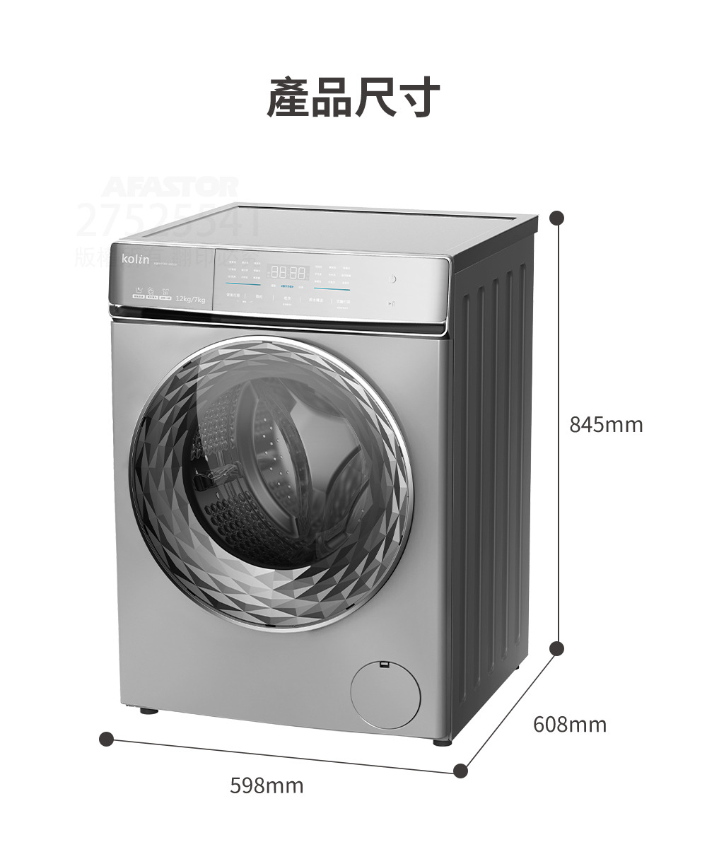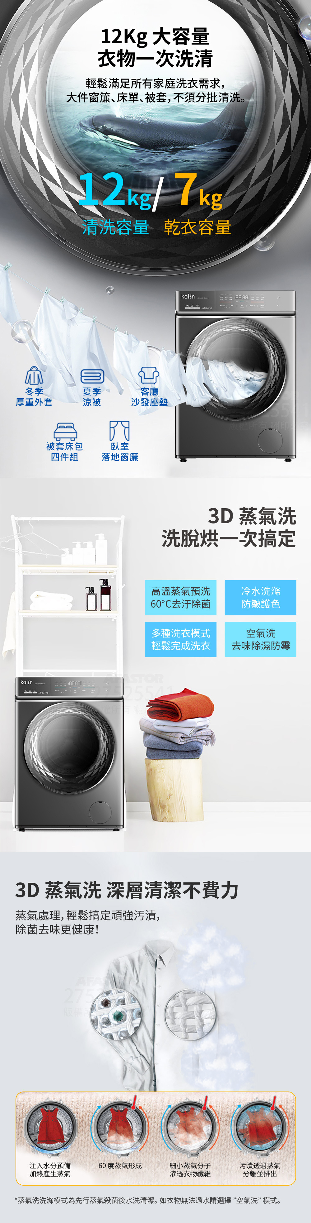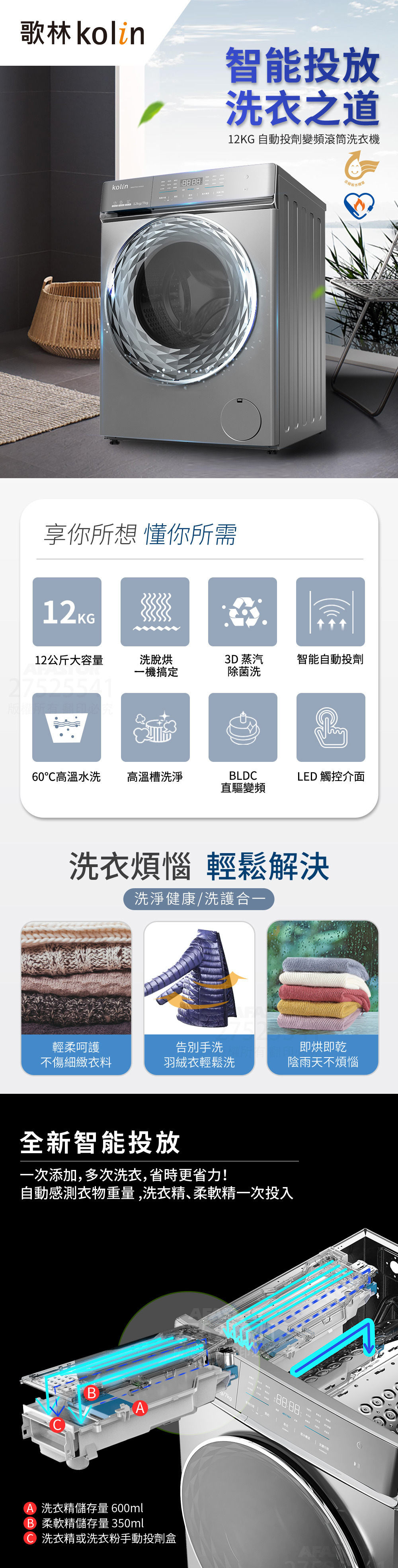 品名:Kolin 歌林 自動投劑蒸洗脫烘變頻滾筒洗衣機12KG