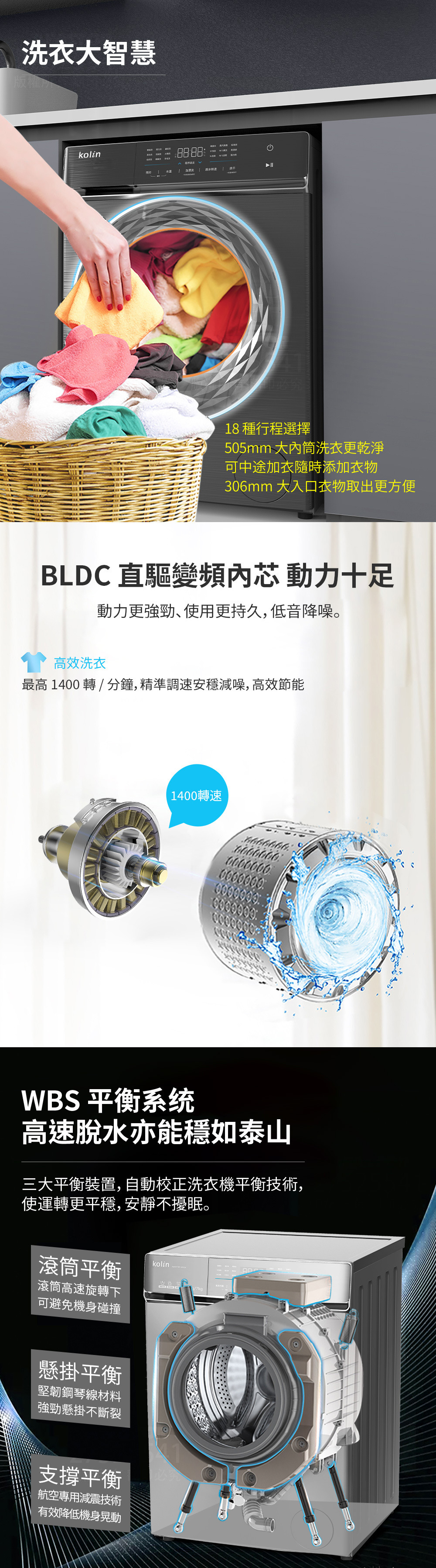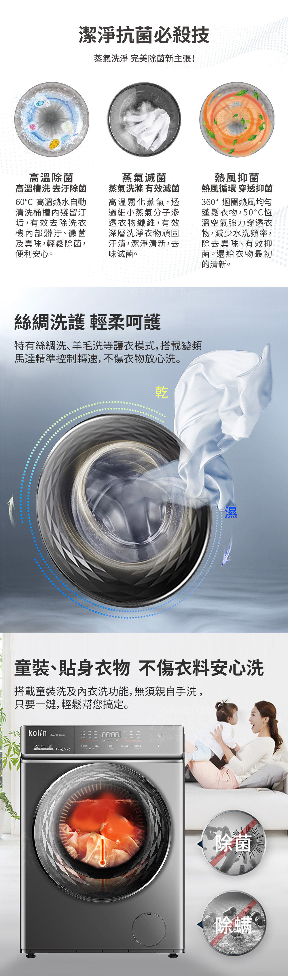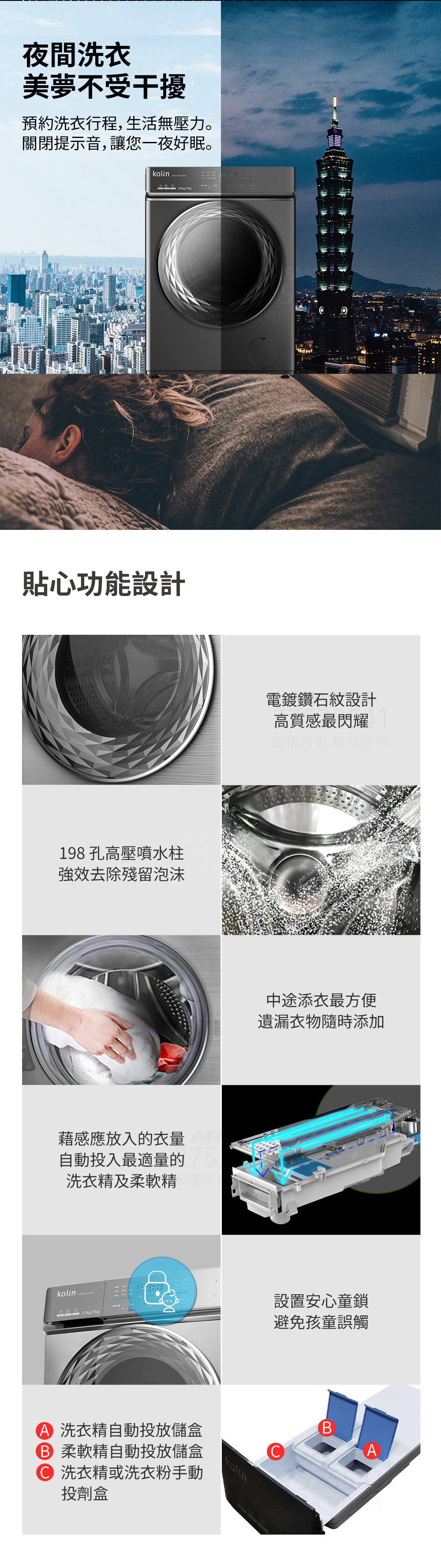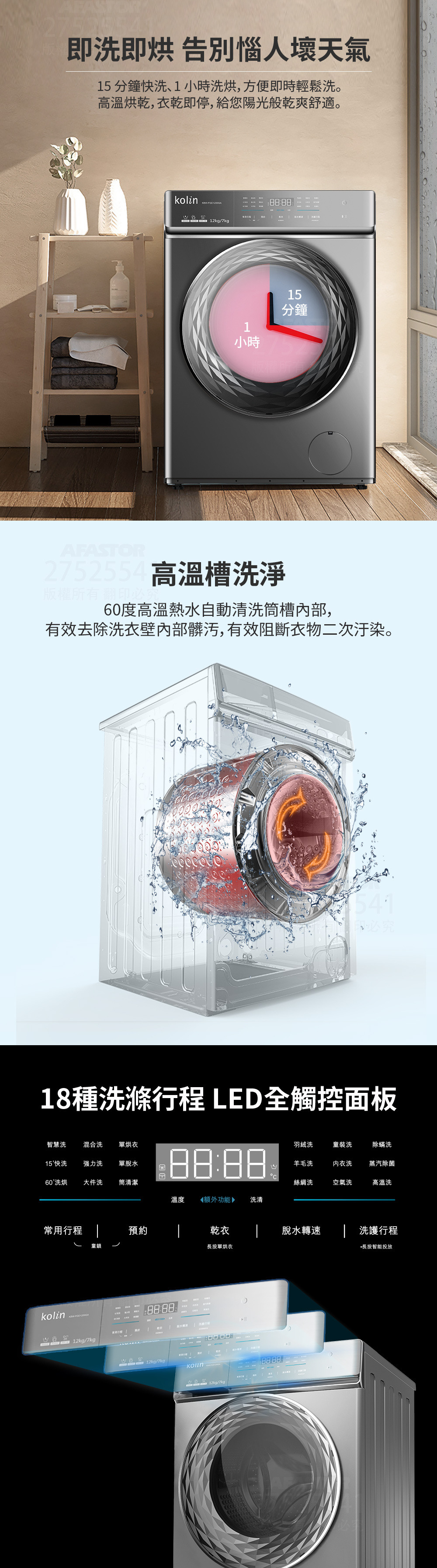 品名:Kolin 歌林 自動投劑蒸洗脫烘變頻滾筒洗衣機12KG