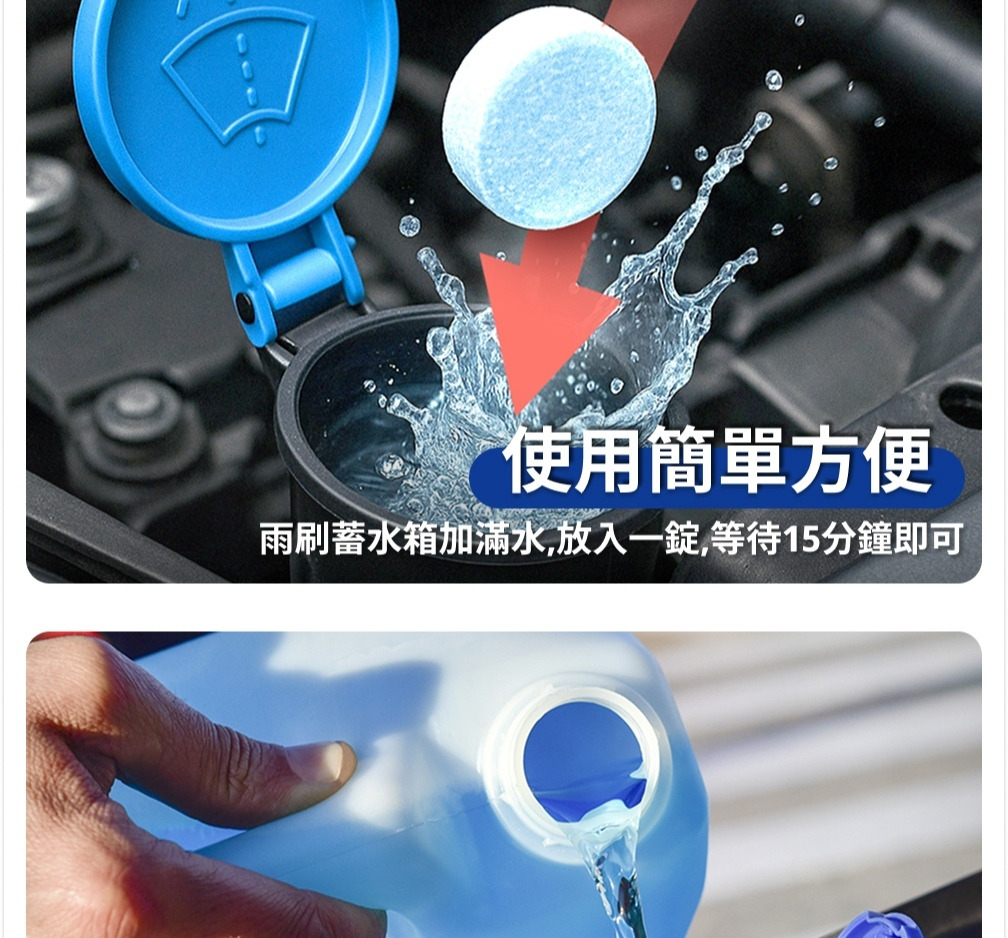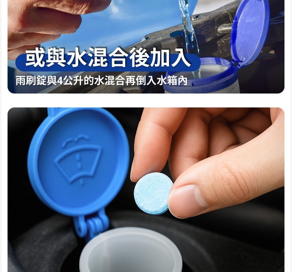 1.將雨刷蓄水箱加滿水,再放一錠雨刷清潔錠進去,等待15分鐘即可。