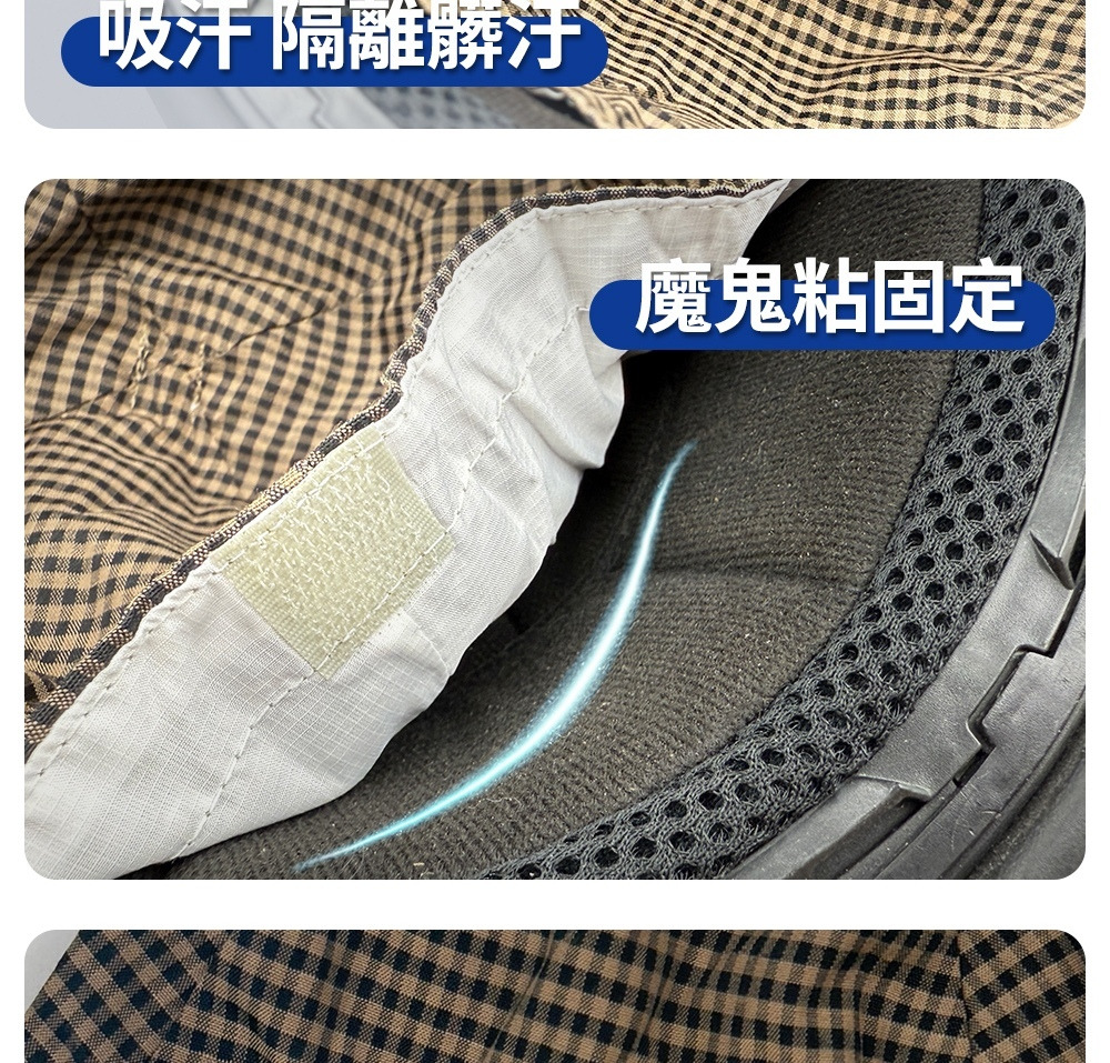 使用方法:請將本內襯套之粘扣帶貼附於安全帽內固定即可