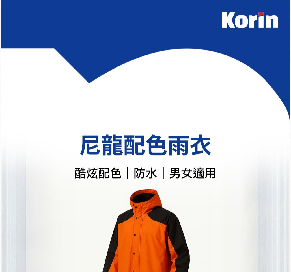 時尚防雨新選擇!【KORIN】尼龍配色雨衣採用高密度防水尼龍布料製成,具備優異的防潑水與防風效果,輕盈不黏膩、穿著舒適。亮眼拼色設計打破傳統雨衣單調印象,兼具實用與時尚感。前開式拉鍊設計方便穿脫,連帽搭配高領防滲結構,有效阻擋雨水灑入。適合通勤、騎車與戶外活動使用,是雨天防護的高質感選擇。