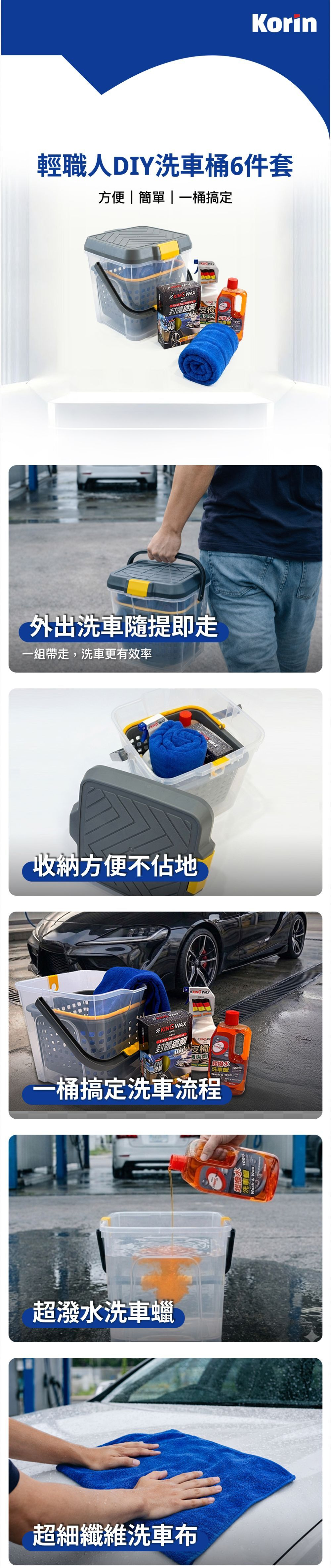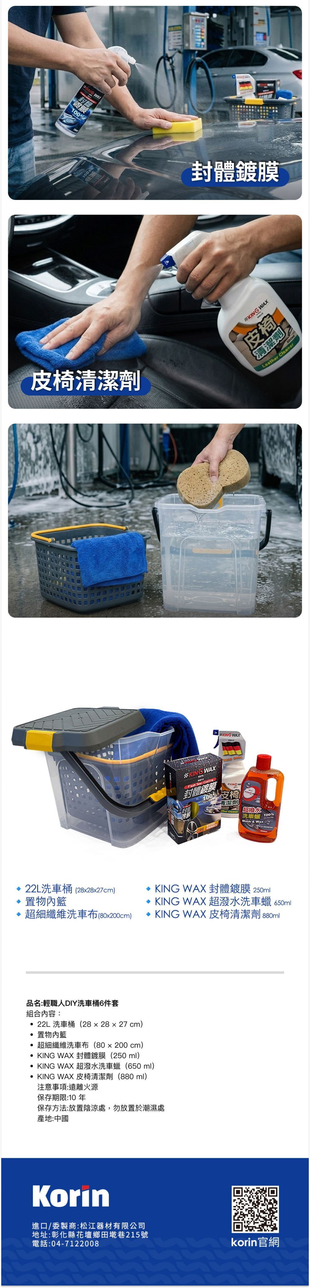 內容物: KING WAX封體鍍膜250ML KING WAX皮椅清潔劑880ML 超細纖維洗車布80*200cm KING WAX超撥水洗車蠟650ML(贈品) 置物內籃 洗車桶22L(28*28*27CM)