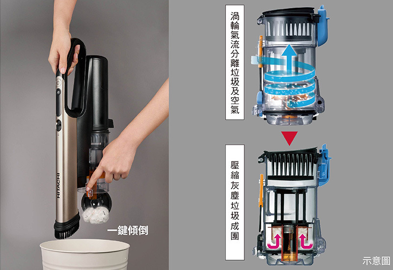 渦輪氣流分離垃圾及空氣,壓縮灰塵垃圾成團。