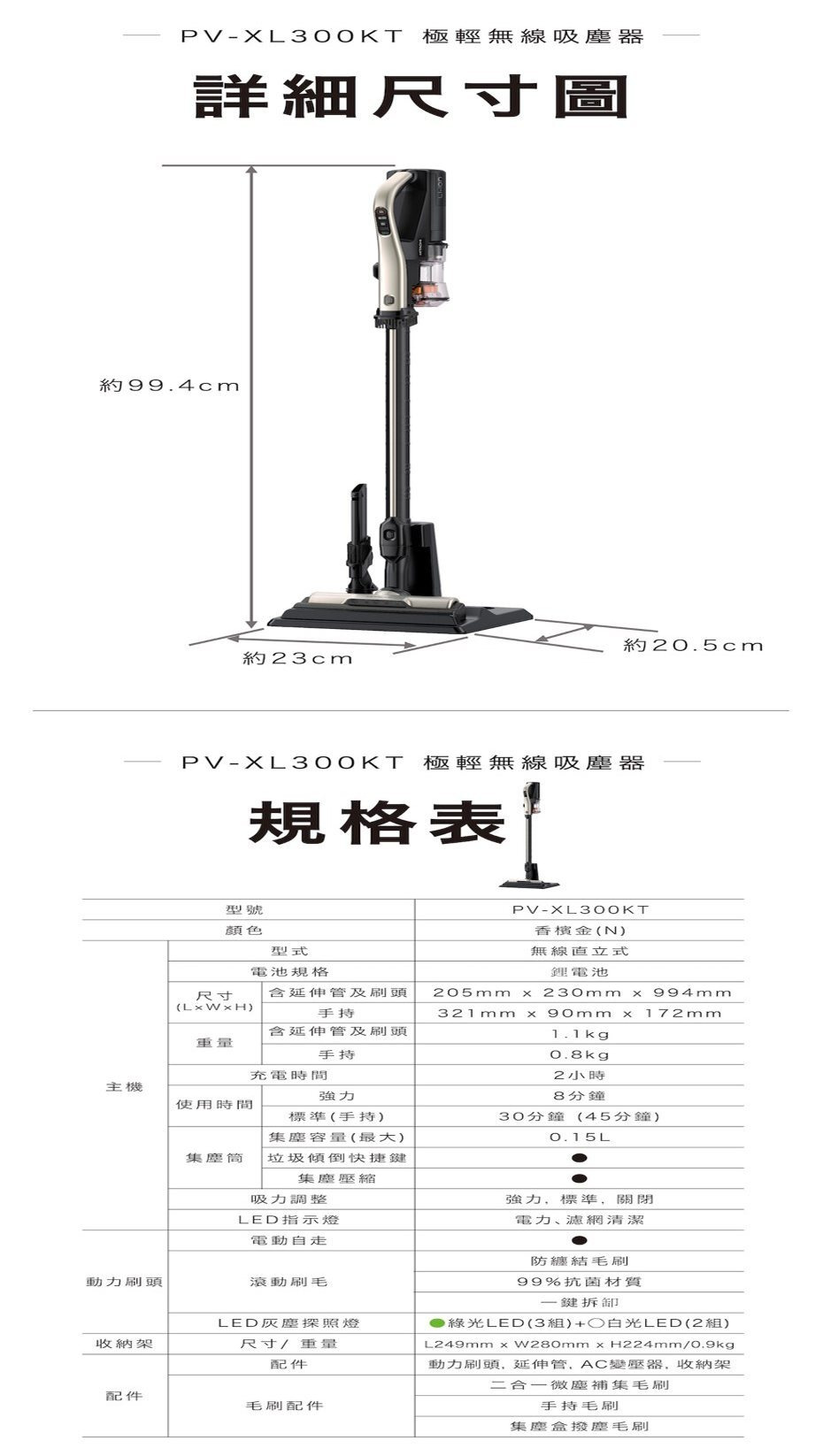 產品尺寸:〈直立尺寸〉205 × 230 × 994 mm 〈手持尺寸〉321 × 90 × 172 mm