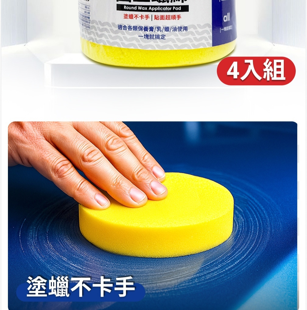 愛車保養更輕鬆!採用柔軟高密度海綿材質,質地細膩不傷漆面,能均勻塗抹蠟品或拋光劑,讓車身光亮如新。圓形造型握感舒適,方便掌控力道與塗抹範圍,不留刮痕、不掉屑。無論手工打蠟或日常清潔保養,都能達到專業等級的亮澤效果。4入組設計,實用又超值!