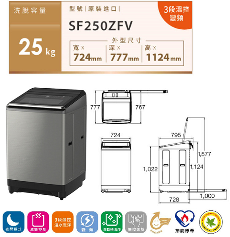 HITACHI 日立 三段溫控變頻直立式洗衣機 星燦銀 25公斤|SF250ZFV-SS