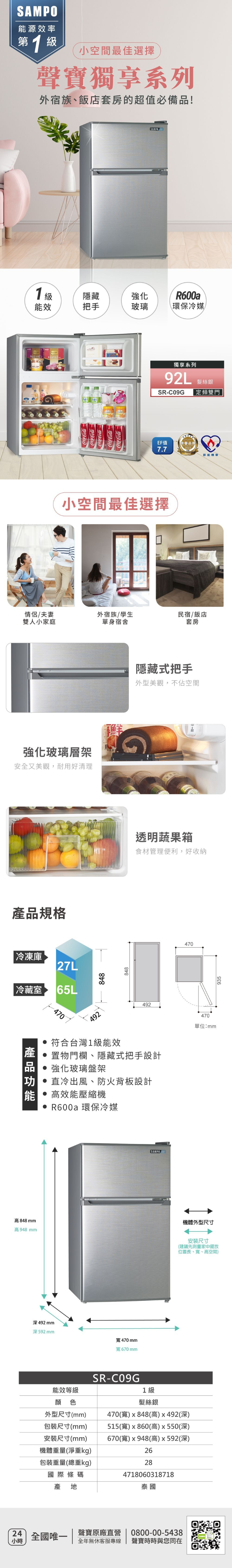 SAMPO聲寶 獨享系列定頻雙門小冰箱-髮絲銀 92公升|SR-C09G