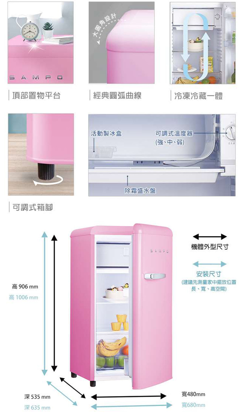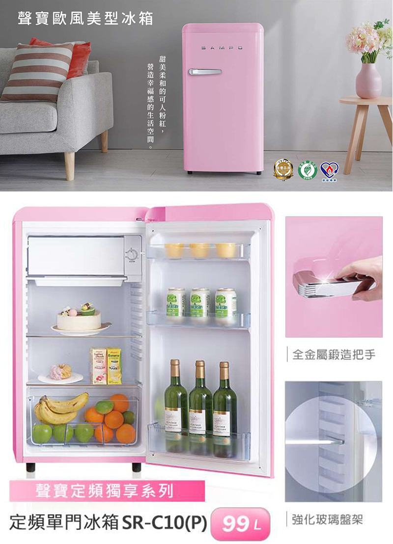 品名:SAMPO聲寶 歐風復古美型系列定頻右開單門冰箱-粉彩紅 99公升