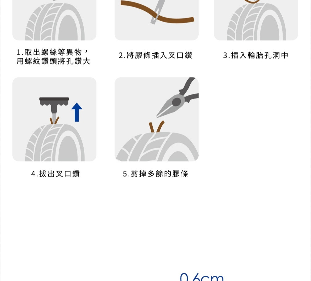 使用方法:使用補胎工具、將膠條塞進輪胎內後,再修整輪胎表面即可。