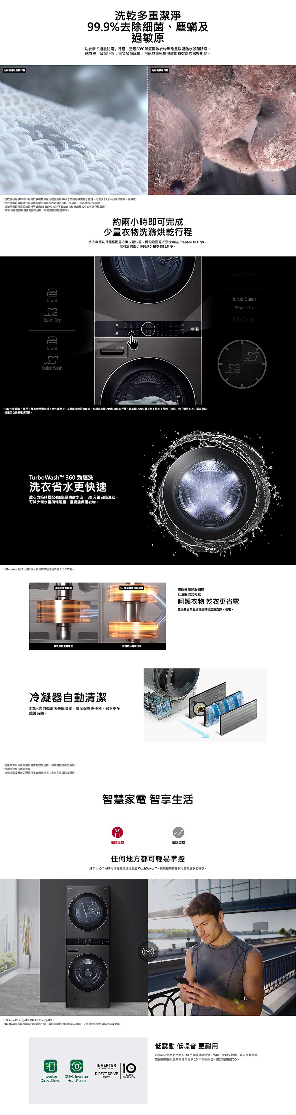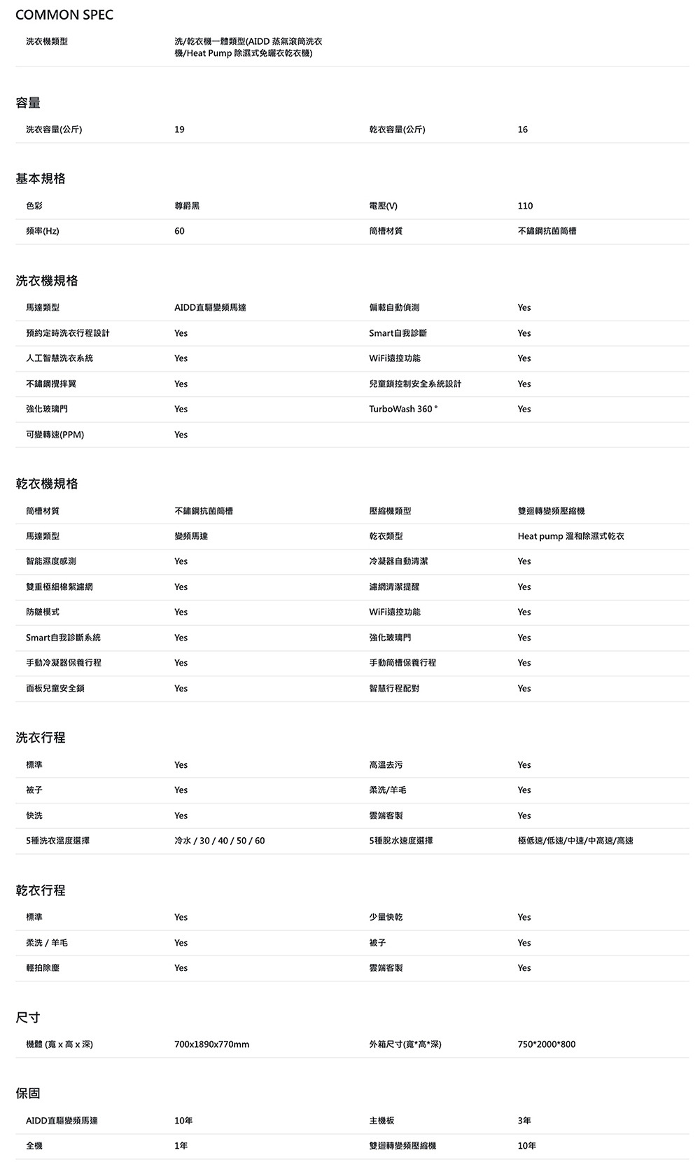 ●洗衣機:AIDD ™直驅變頻馬達/乾衣機:雙迴轉變頻壓縮機、變頻馬達 皆10年保固